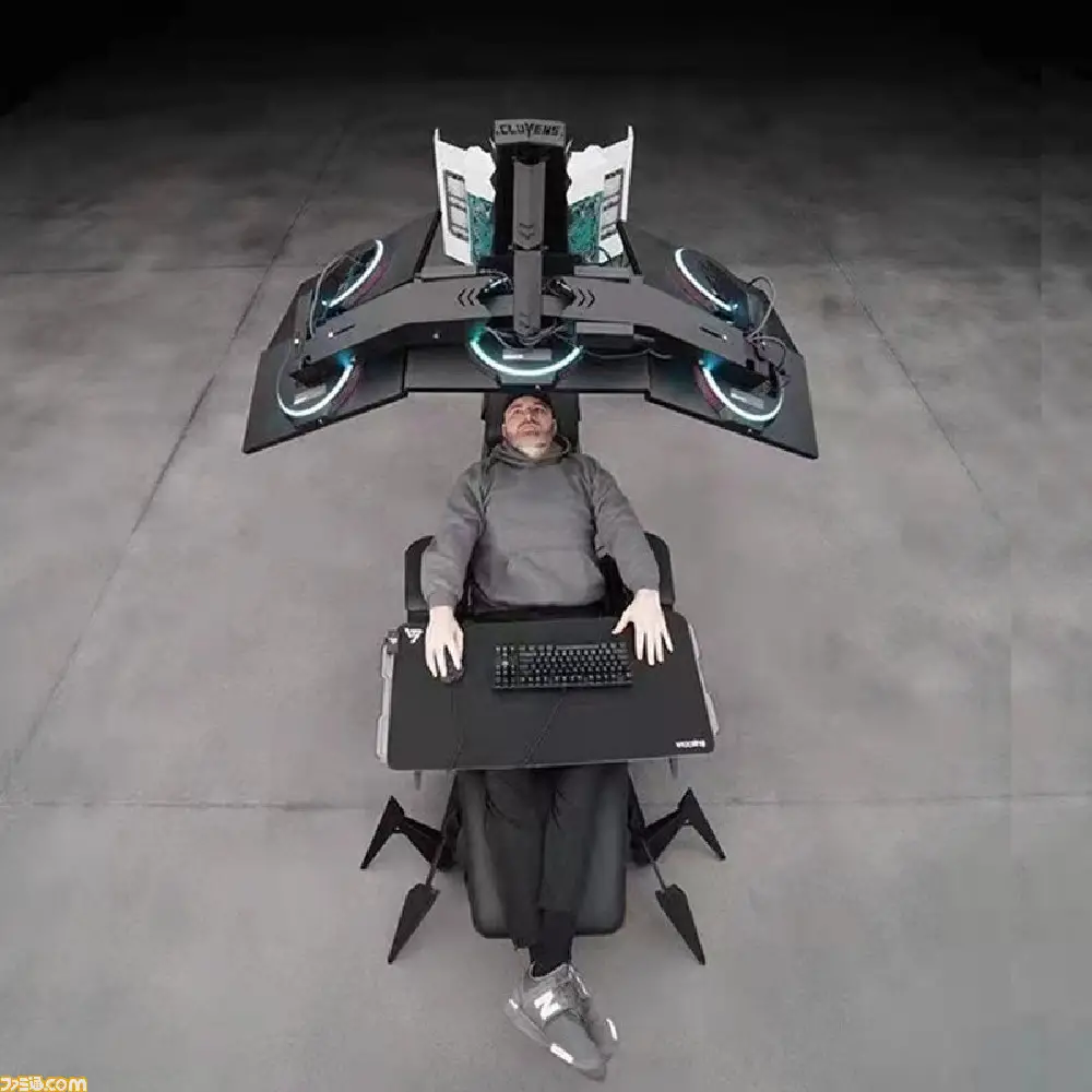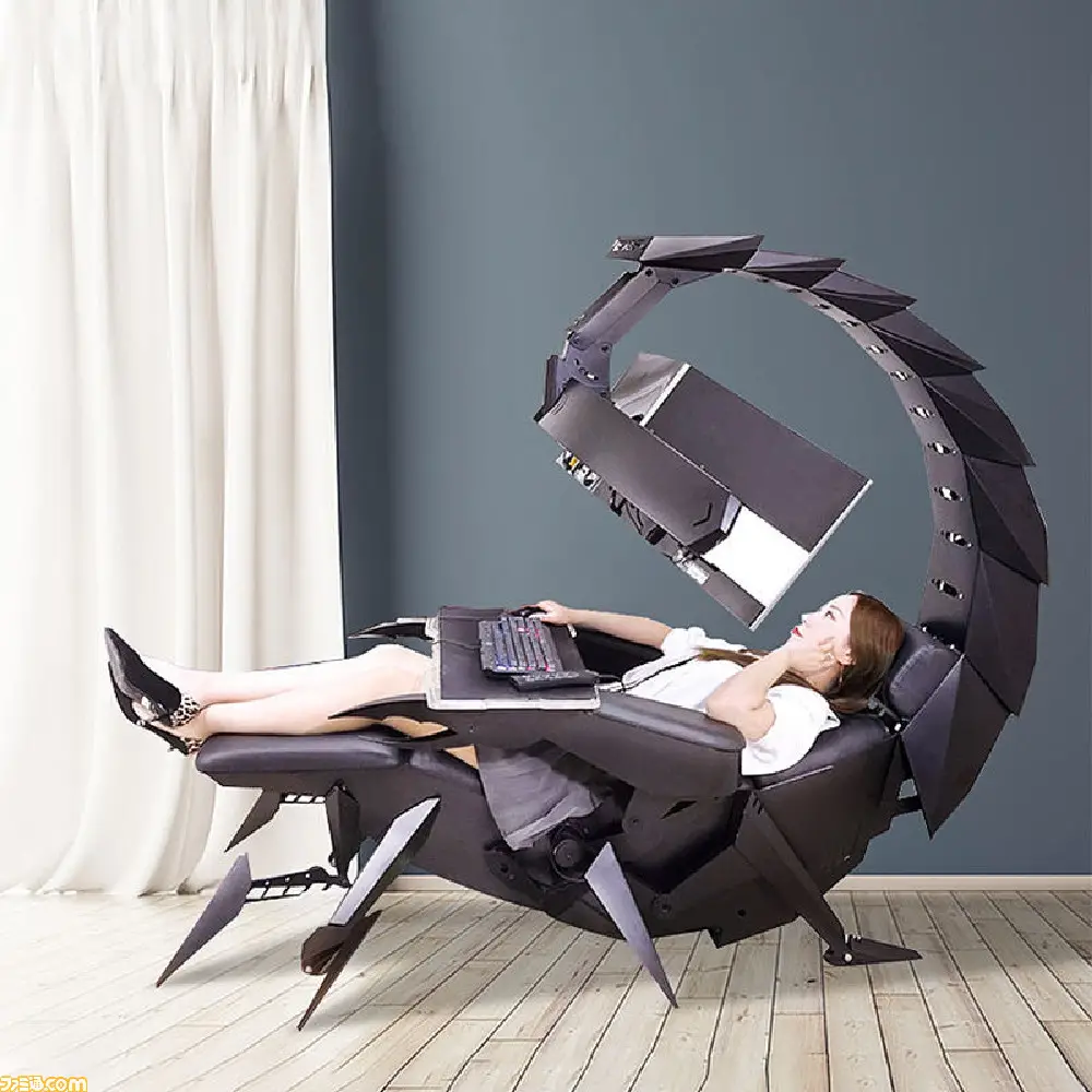 https://www.famitsu.com/images/000/253/153/y_621ed2bc0e43d.webp本商品はサソリのよう近未来的デザインが特徴。アーチ状の先端にモニターを取り付けることができ、リクライニングとフラットポジションの好きな体制でゲームや動画鑑賞を楽しめる。モニターの高さや距離、リクライニングチェアの昇降、各種照明の設定はコントロールパネルで簡単に行える。