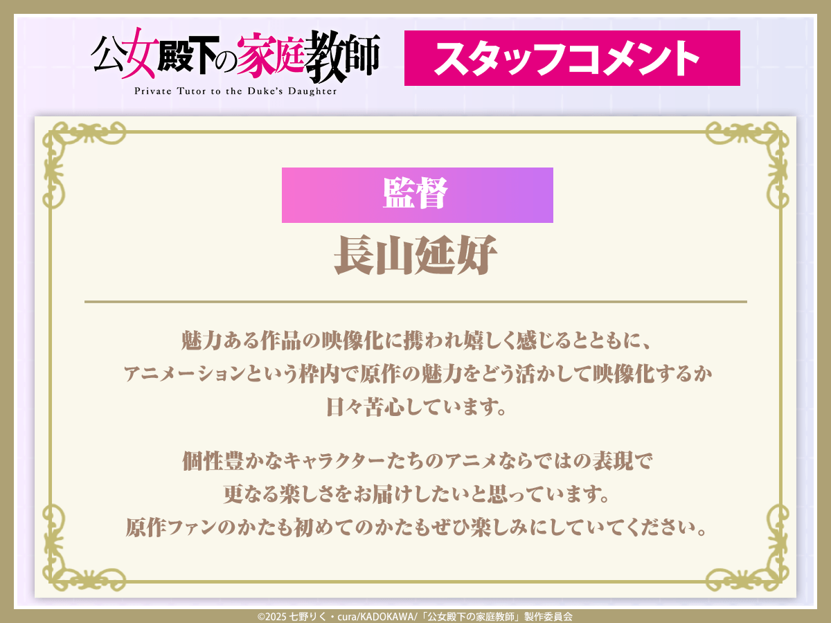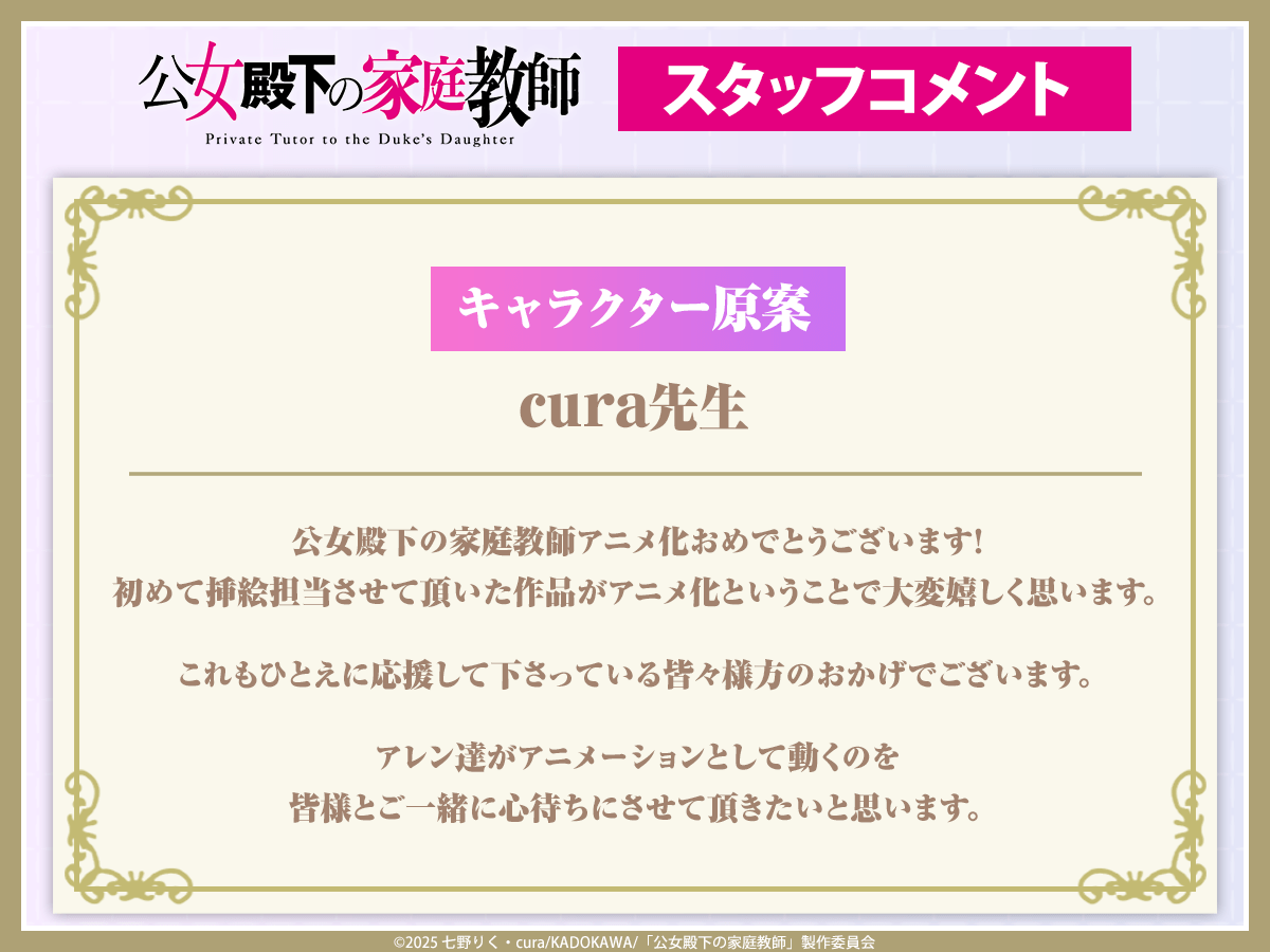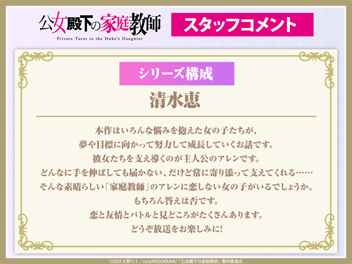 2025年放送開始の「公女殿下の家庭教師」は、七野りくによる小説が原作のファンタジー作品。規格外の魔法技術を持つ青年・アレンが、魔法がまったく使えない公爵家の次女・ティナの家庭教師に選ばれたことから物語が始まる。