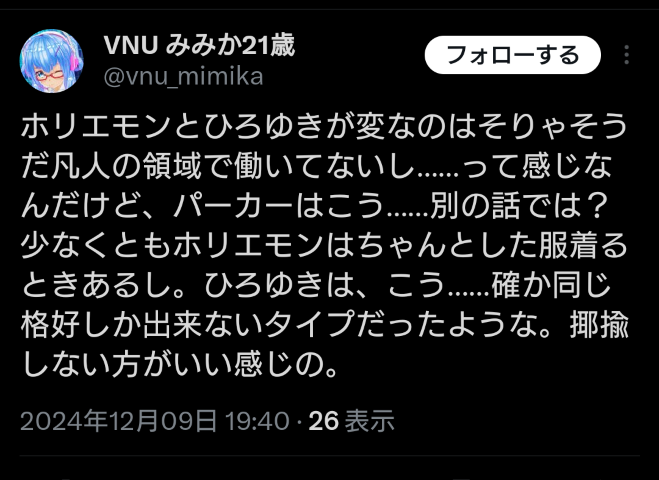 - 26 名前:ひみつの名無しさん 投稿日時:2024/12/09(月) 21:14:29.29 ID:bMR3Ogjy0