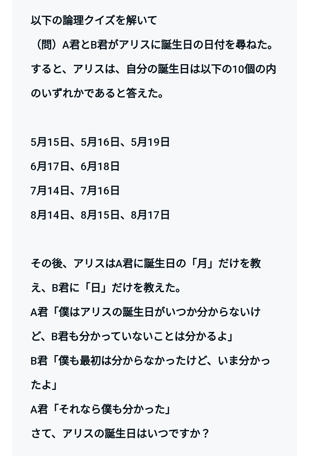 6/17だった場合は18と19を弾いた時点でA君が分かってしまうンゴ - 4 名前:ひみつの名無しさん 投稿日時:2025/01/09(木) 15:06:28.80 ID:NXdevhMK0
