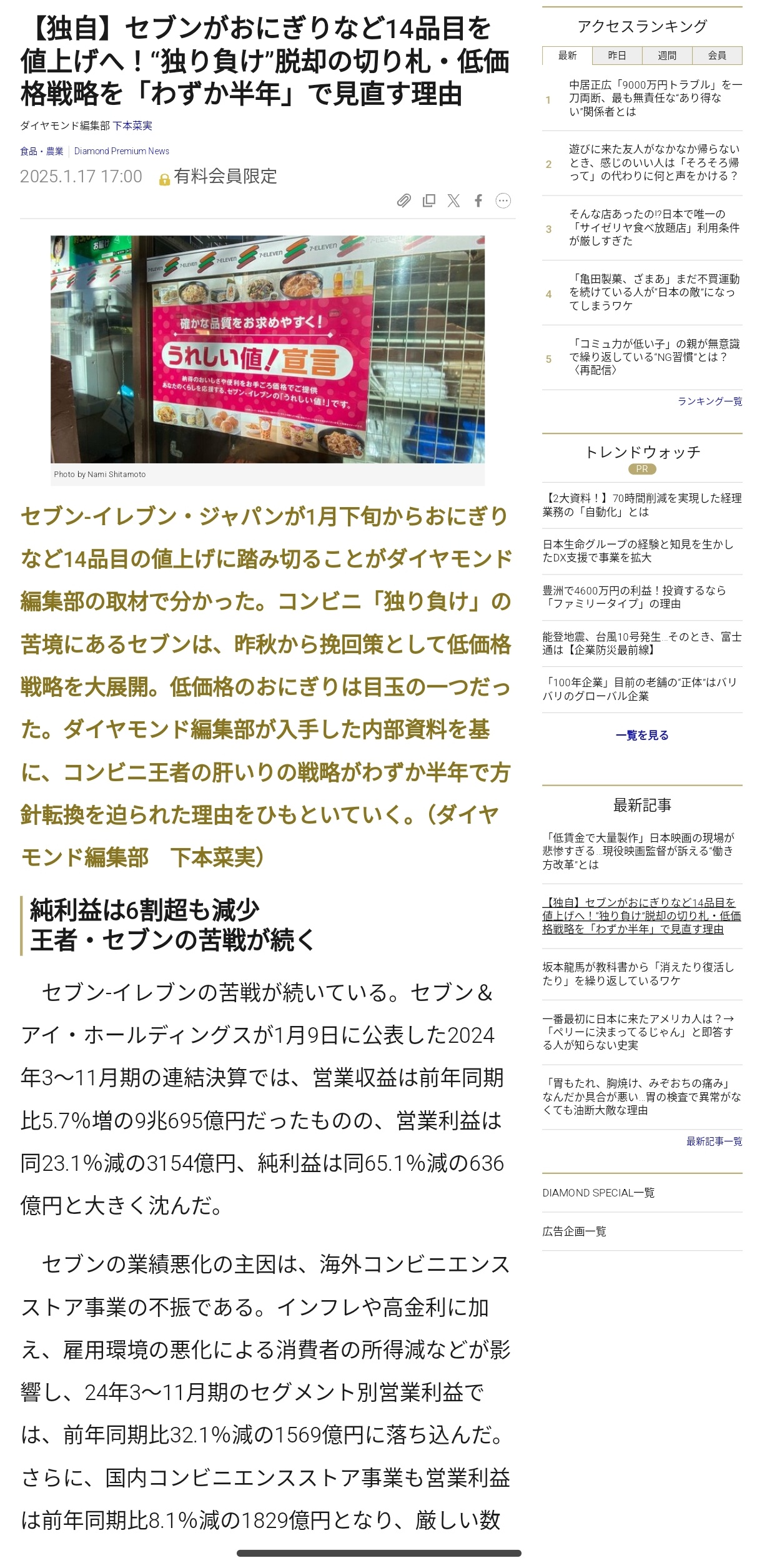 セブンイレブンさん、北米コンビニ事業の業績悪化を受け国内7の「うれしい値」を半年で廃止しおにぎり他を値上げへ