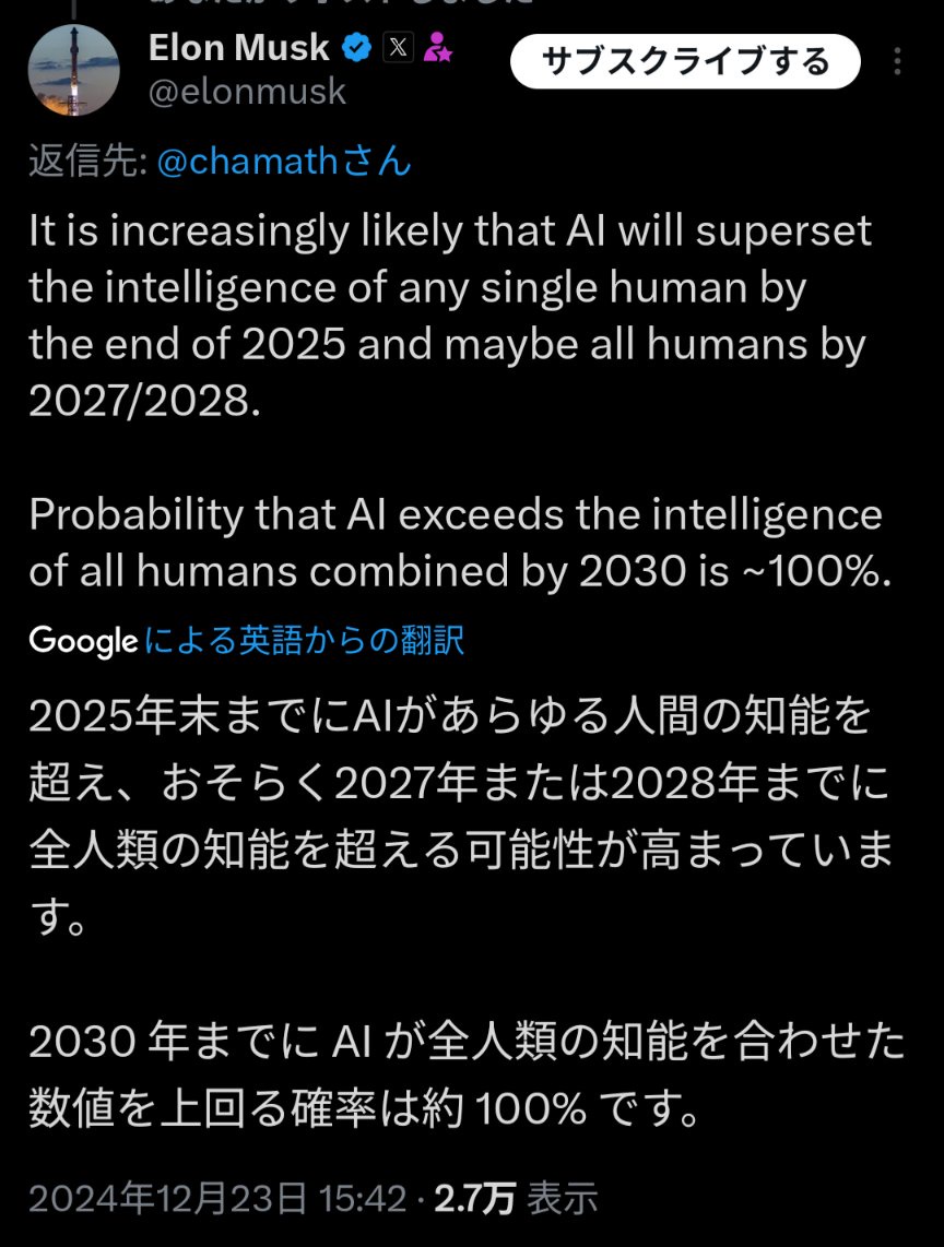 【超朗報】マスク氏「今年中(2025年)にAIはあらゆる人間の知能を超える!!」👈こいつDeepseekの登場知ってただろw