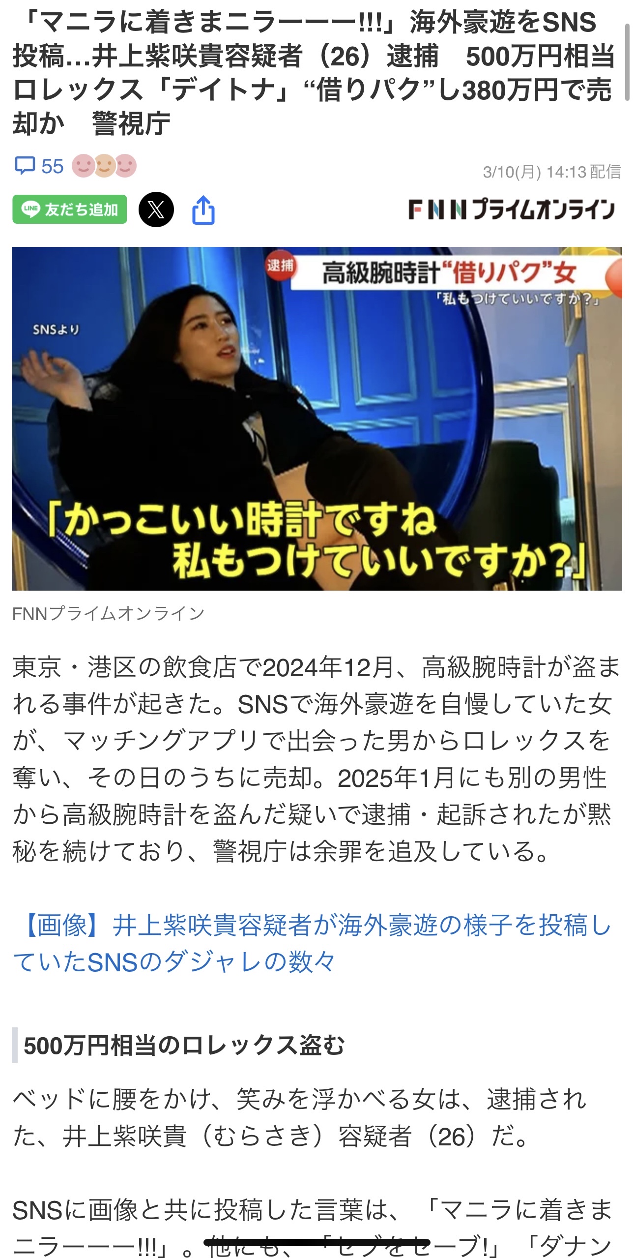 「マニラに!!着きまニラニラーーー!!!!」 海外豪遊をSNSで報告していた腕時計泥棒の井上紫咲貴ちゃん(26)、逮捕