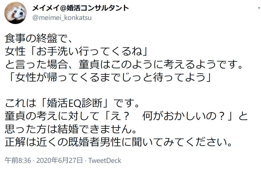 婚活コンサルタント「童貞は会計時に女子がトイレに行くと“帰ってくるまでじっと待ってよう”と考えます。」
