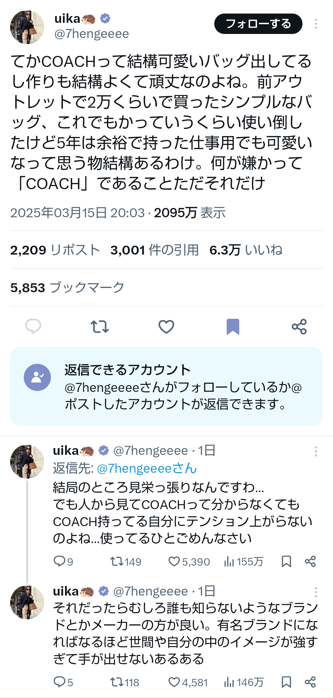 女氏「コーチって可愛いバッグ出してるし作りもよくて頑丈だけど、何が嫌かって『コーチ』であること。わかる?」