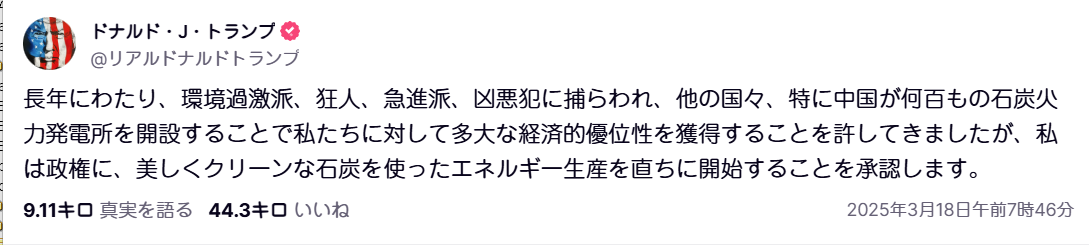 トランプ「極左が推進してきクリーンエネルギーなんてクソ、石炭掘りまくってエネルギー価格下げまくるぞ!」