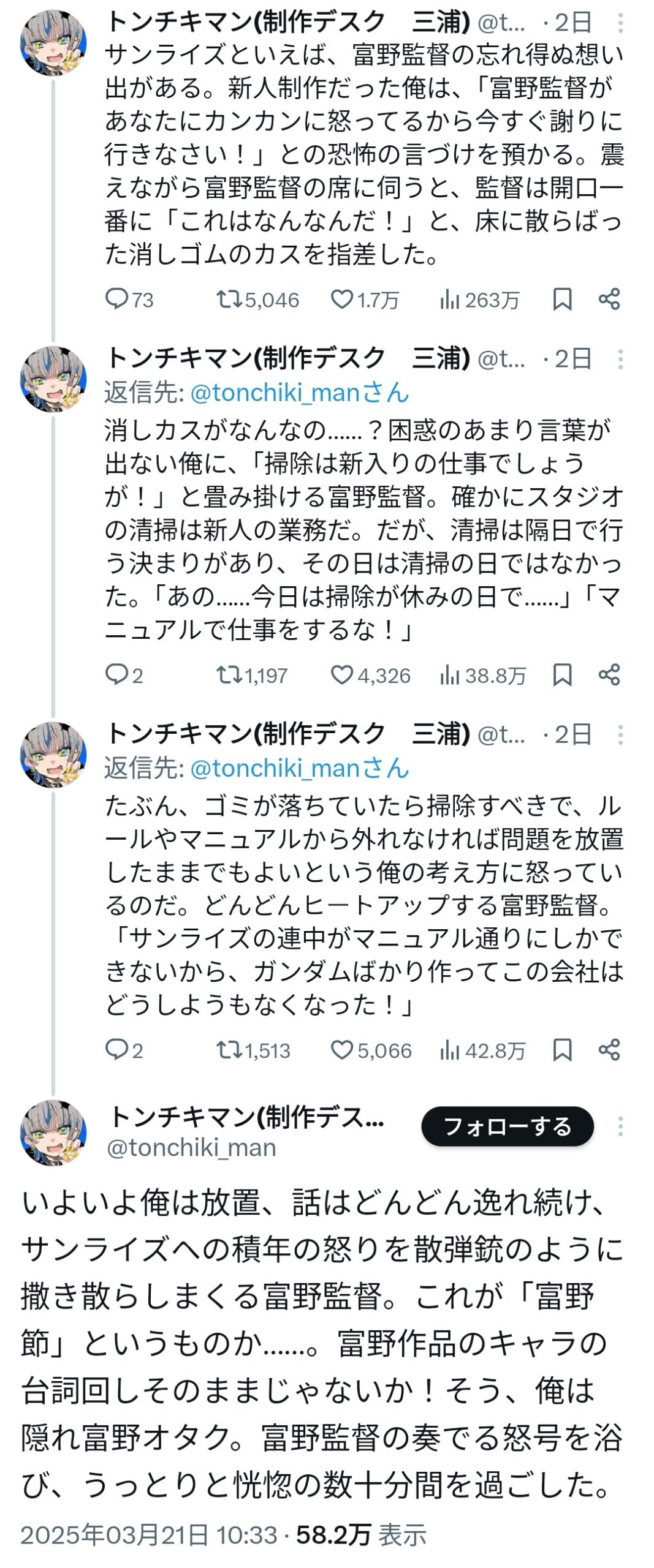 富野由悠季「この散らばった消しゴムのカスは何?掃除は新入りの仕事でしょうが!」新人「あの…今日は掃除の日じゃ…」→富野、ブチギレ