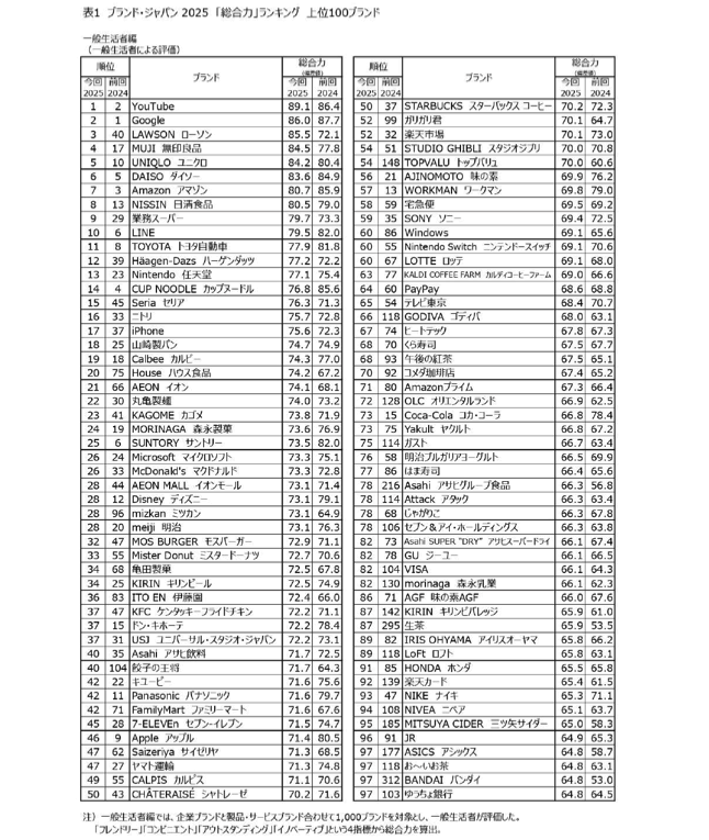 消費者が選ぶ強いブランドランキング1位「YouTube」2位「Google」3位「ローソン」4位「無印良品」5位「ユニクロ」
