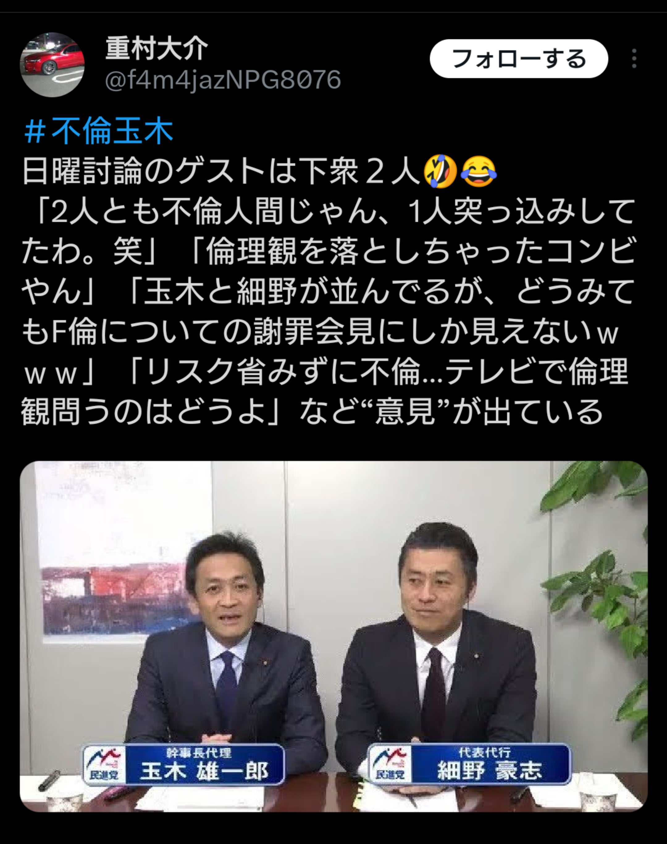 民主党じゃなくて細野豪志を支持するっていうアホで低レベルな権威主義が当選させたってコト? - 28 名前:ひみつの名無しさん 投稿日時:2025/03/30(日) 12:14:38.15 ID:b2w9Njik0
