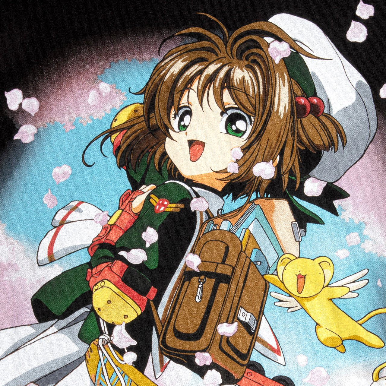 ボディの黒色を利用するブラックマジックとホワイトアンダーコントロールという特殊な技法で分版し、イラストを再現している。「桜」と「ケロちゃん」をデザインした1型展開で、価格は1万2100円。https://www.fashionsnap.com/article/2025-04-01/cardcaptor-sakura-geeksrule/