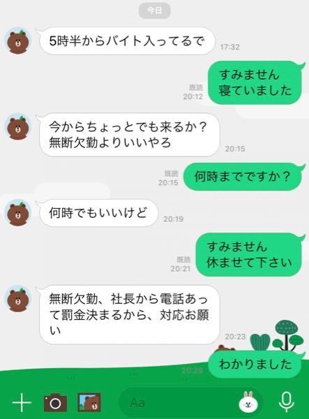 俺氏、昨日バイトを寝過ごした結果とんでもないLINEがバイトリーダーから来るwwwwwwwwwwwwwwwwwwwwwww