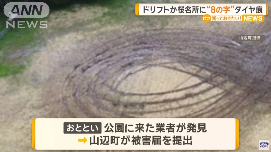 ドリフト走行か 桜名所に“8の字”タイヤ痕 山形・山辺町