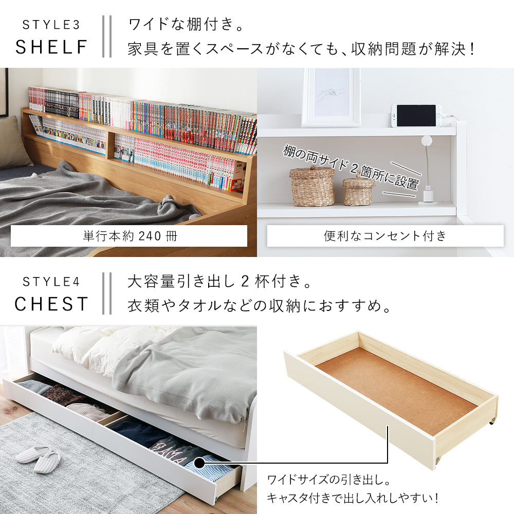 ワイドな棚付き。家具を置くスペースがなくても、収納問題が解決!