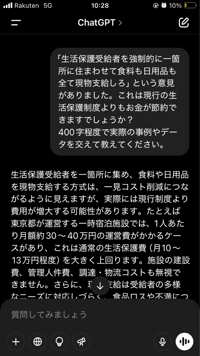 (ヽ゜ん゜)「生活保護は強制的に一つの場所に集めて現物支給にしろ!血税節約になる!」→ChatGPTに完全論破されてしまうWWWWWWWWW