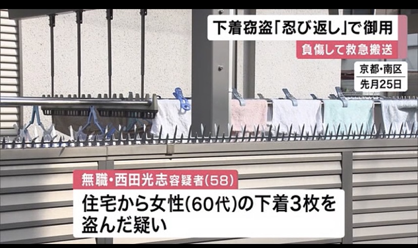 無職の西田光志容疑者(58)は10月25日、京都市南区の住宅で、60代の女性の下着3枚を盗んだ疑いがもたれています。