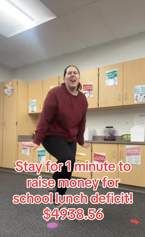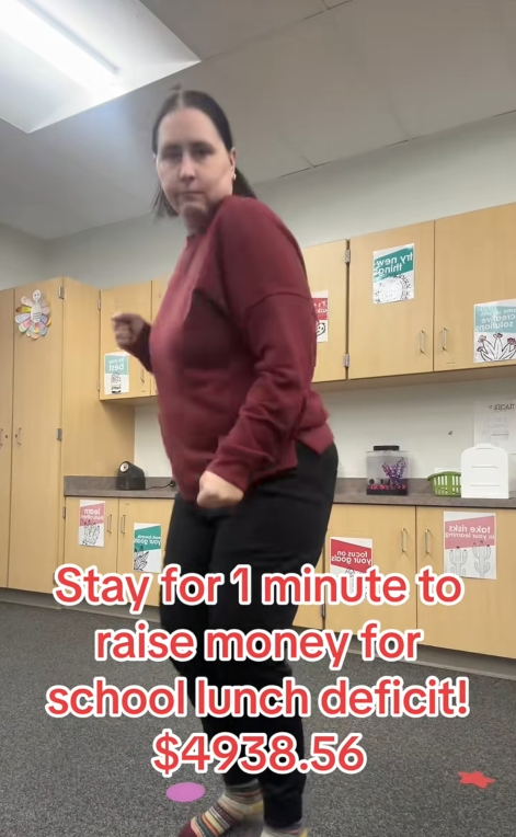 ケイティ先生は、「給食の借金をまかなうために、1分間動画を見て」とつづり、ダンスを披露する動画を投稿しています。