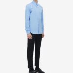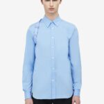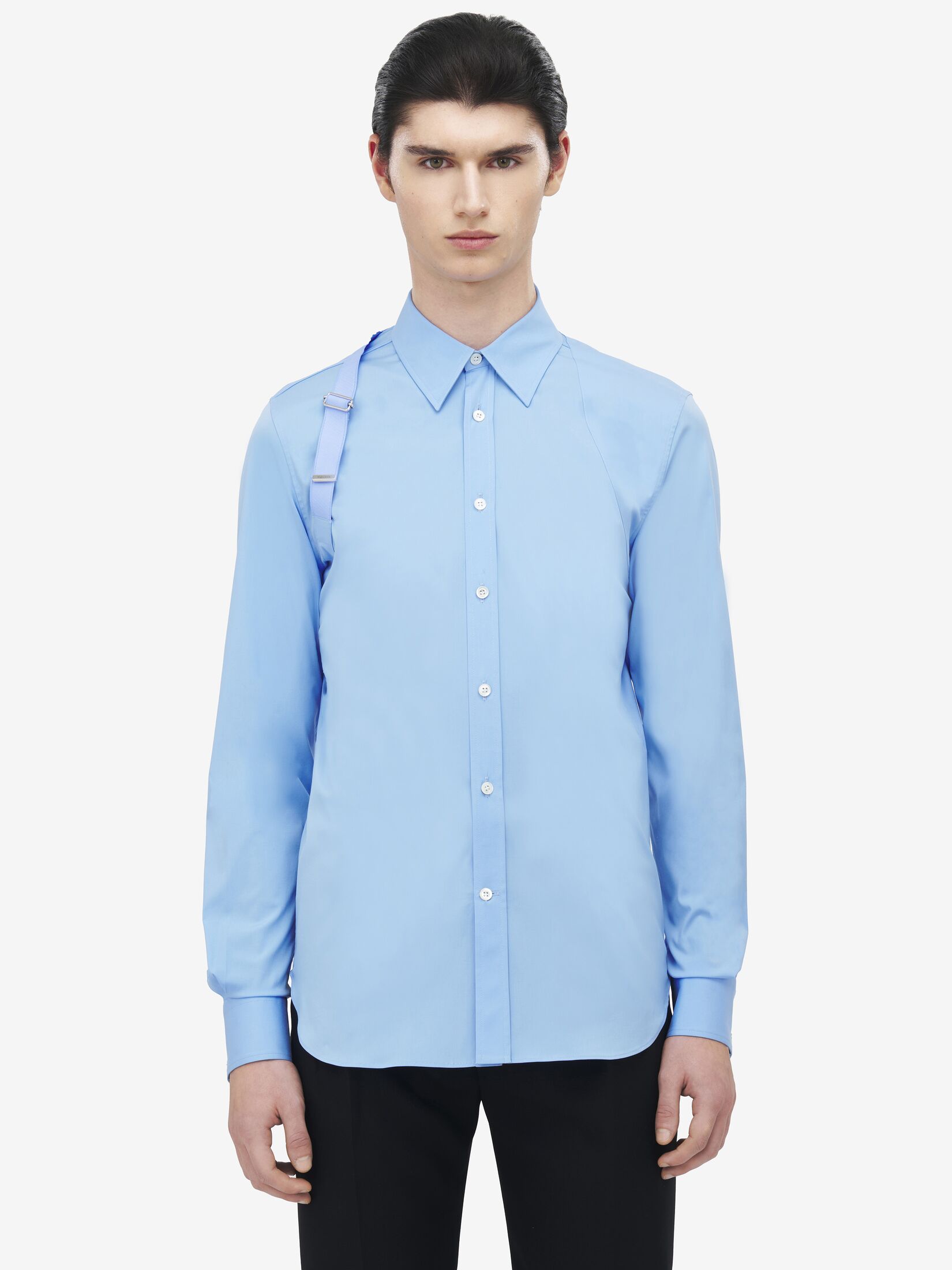 注目は、ハーネスを配した長袖シャツ。ストレッチコットンポプリンのシャツには、マックイーンロゴを配したテープのハーネスを右肩にあしらった。