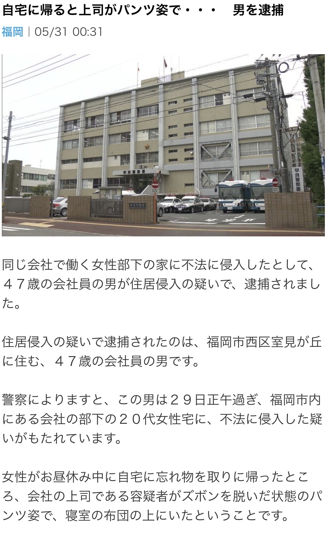20代女「お昼休みに忘れ物をとりに帰宅したら上司47歳男がパンツ姿で布団の上にいた」男を逮捕