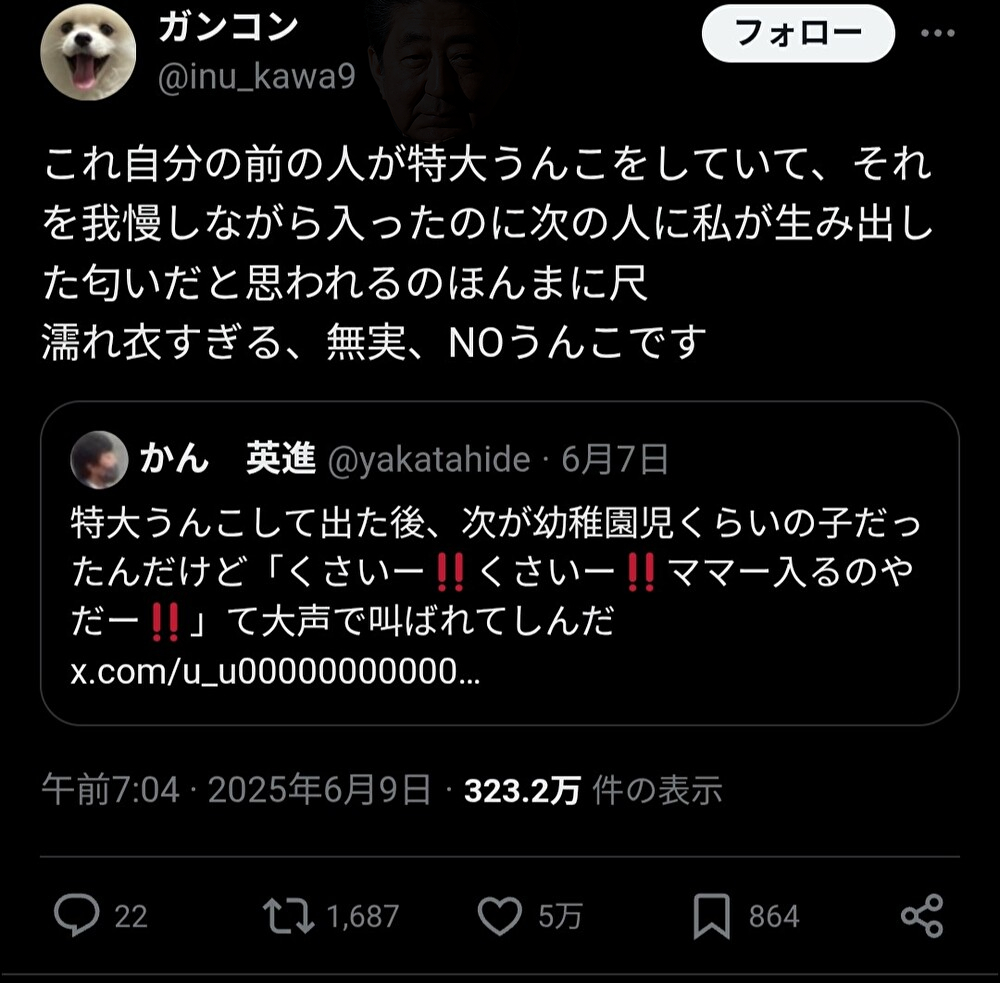 安倍晋三の下痢便の微粒子がお前の鼻や口の中に
