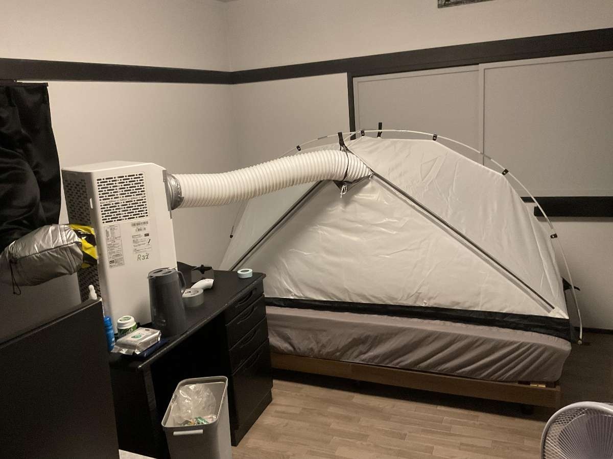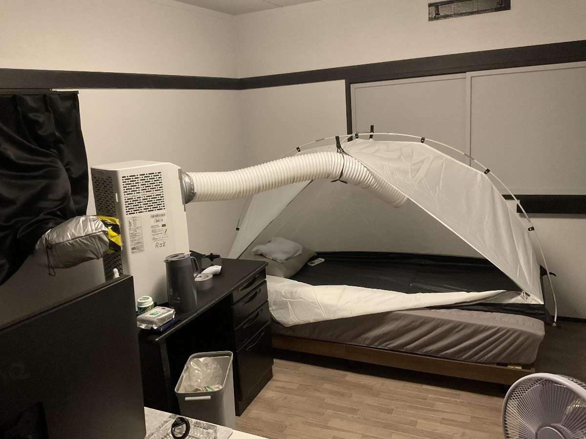 スポットクーラーからの冷風は80%くらいテント内であと20%くらいは部屋全体に行くようにしてるから部屋全体が暑いということはない