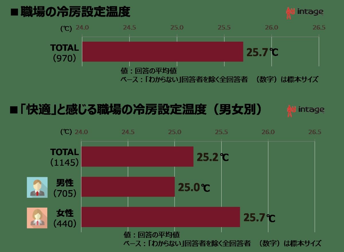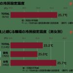 男女別では、男性が快適と感じる設定温度は平均「25.0℃」であるのに対し、女性は「25.7℃」と、男性に比べやや高めです。筋肉量が女性より多い男性は発熱量が多く、女性より暑がりといわれますが、その差が、この調査結果に表れているといえそうです。