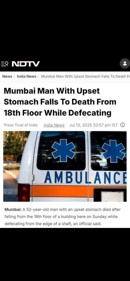 ムンバイの52歳の男性がエレベーターシャフトで排便しようとして18階から転落し死亡した。