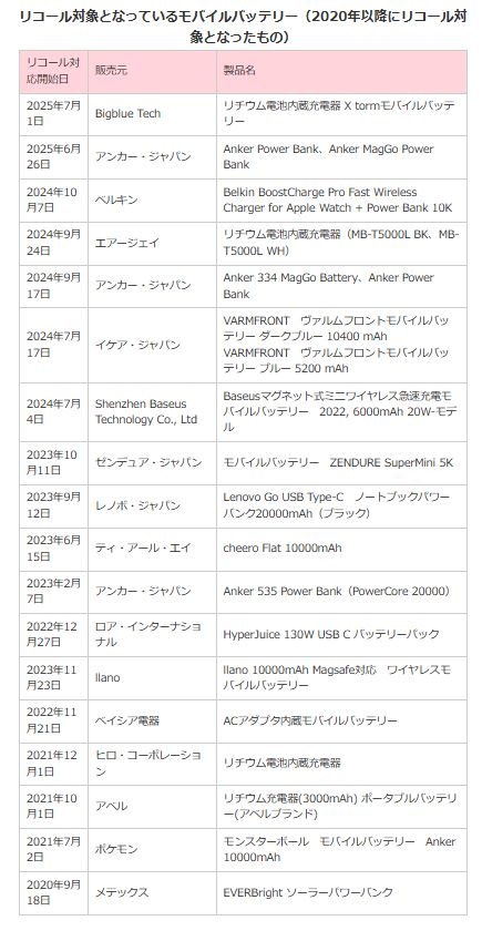 モバイルバッテリー、2025年7月時点で回収中の製品まとめ