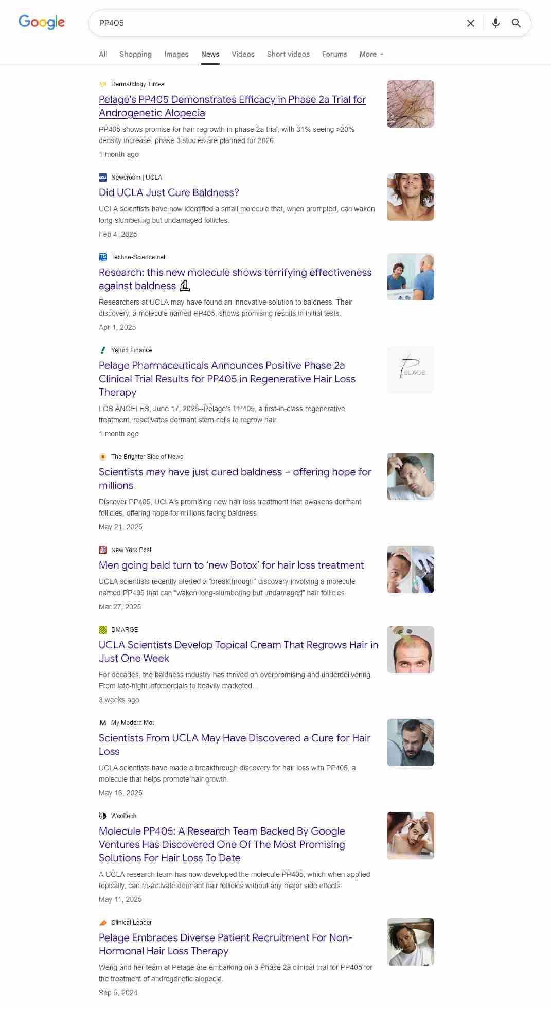 フェーズ2a試験(2024年開始、NCT06393452):78人の男女(18~55歳)を対象に、0.05% PP405ジェルまたはプラセボを4週間毎日塗布し、12週間追跡調査。結果として、治療を受けた男性の31%が8週目で毛髪密度が20%以上増加し、プラセボ群では0%でした。また、以前毛髪がなかった領域での新たな毛髪成長が観察され、再生の可能性が示唆されました。次のステップ:Pelage Pharmaceuticalsは2026年にフェーズ3試験を開始予定で、2027~2028年にFDAまたはEMAへの新薬申請(NDA)を目指しています。
