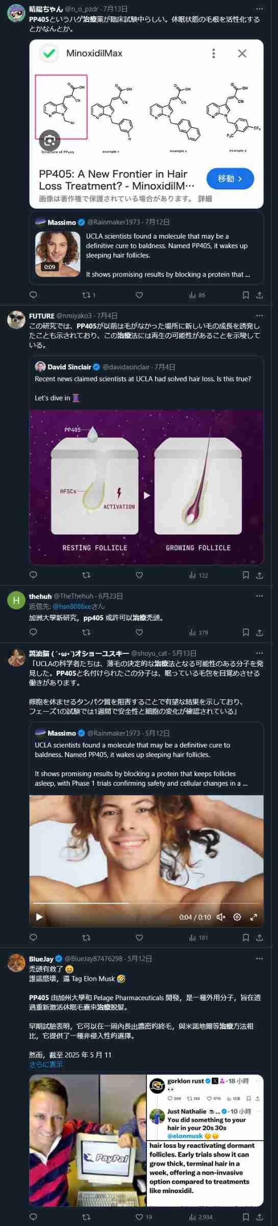 Xの投稿では、PP405がミノキシジルやフィナステリドと併用可能で、毛包幹細胞を活性化する新しいアプローチとして期待されていることが話題になっています。