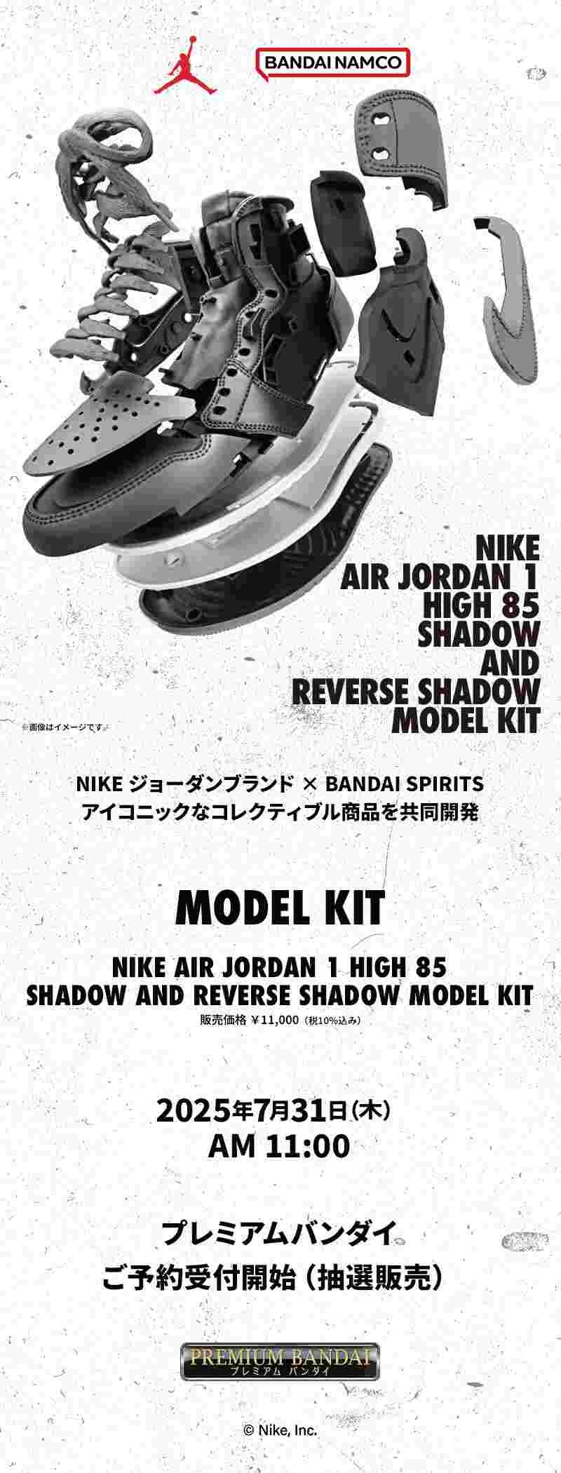 プレミアムバンダイにティザーページもオープン。2025年7月31日(木)11時よりプレミアムバンダイにて予約受付開始(抽選販売)なので、お見逃しなく バンダイ・BANDAI SPIRITSとジョーダンブランドがコラボレーション!BANDAI SPIRITSからプラモデルが発売決定! | 電撃ホビーウェブプラモデル「NIKE AIR JORDAN 1 HIGH 85 SHADOW AND REVERSE SHADOW MODEL KIT」が発売決定!プレバンにて7月31日(木)11時より抽選販売!hobby.dengeki.com