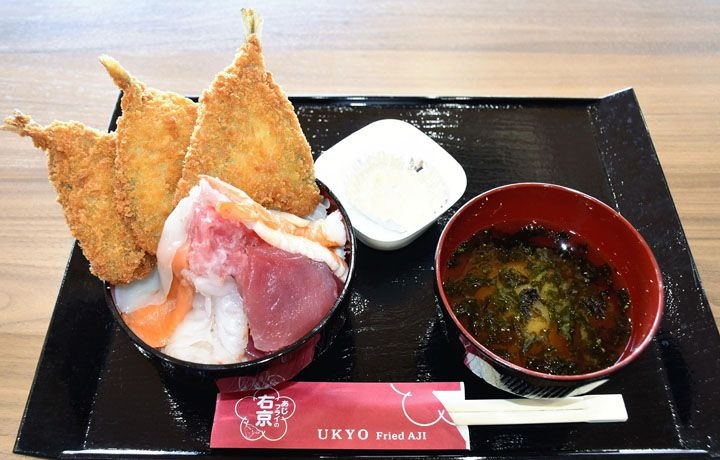 いわき・ら・ら・ミュウ内のあじフライの右京はオープンを記念し、今月8日までの期間限定で「あじフライ海鮮丼」を提供している。