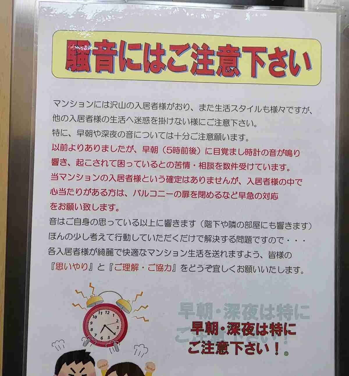 某タワマン、ガチでおわる、壁が薄すぎて目覚まし時計禁止に