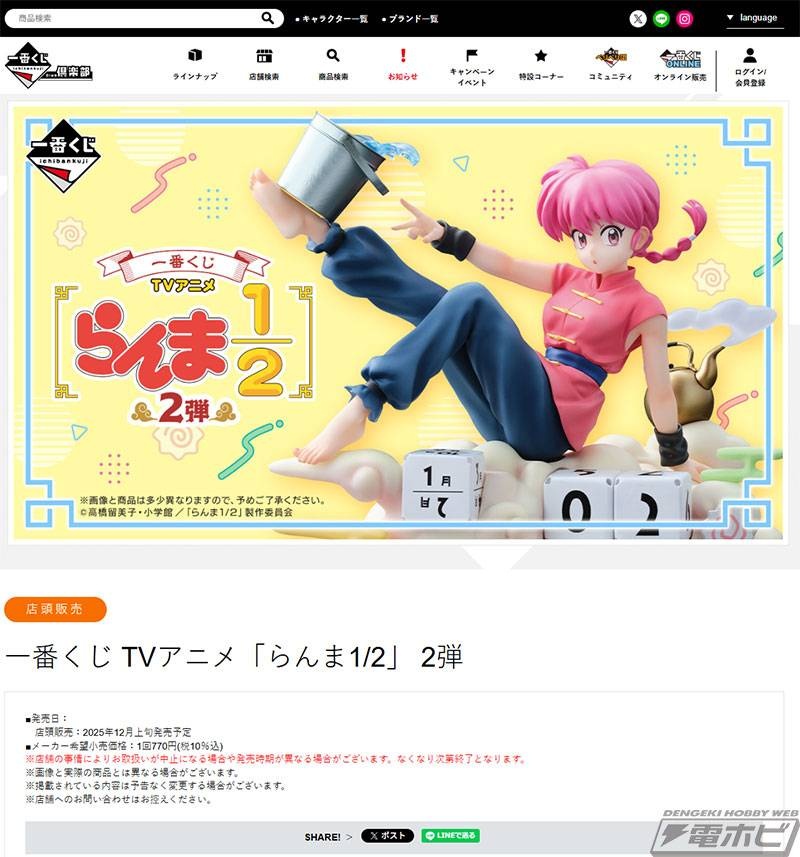 BANDAI SPIRITS ロト・イノベーション事業部の公式サイト「一番くじ倶楽部」にて、「一番くじ TVアニメ『らんま1/2』2弾」ページが公開。2025年12月上旬発売予定と発表されました。フィギュア画像もお披露目!