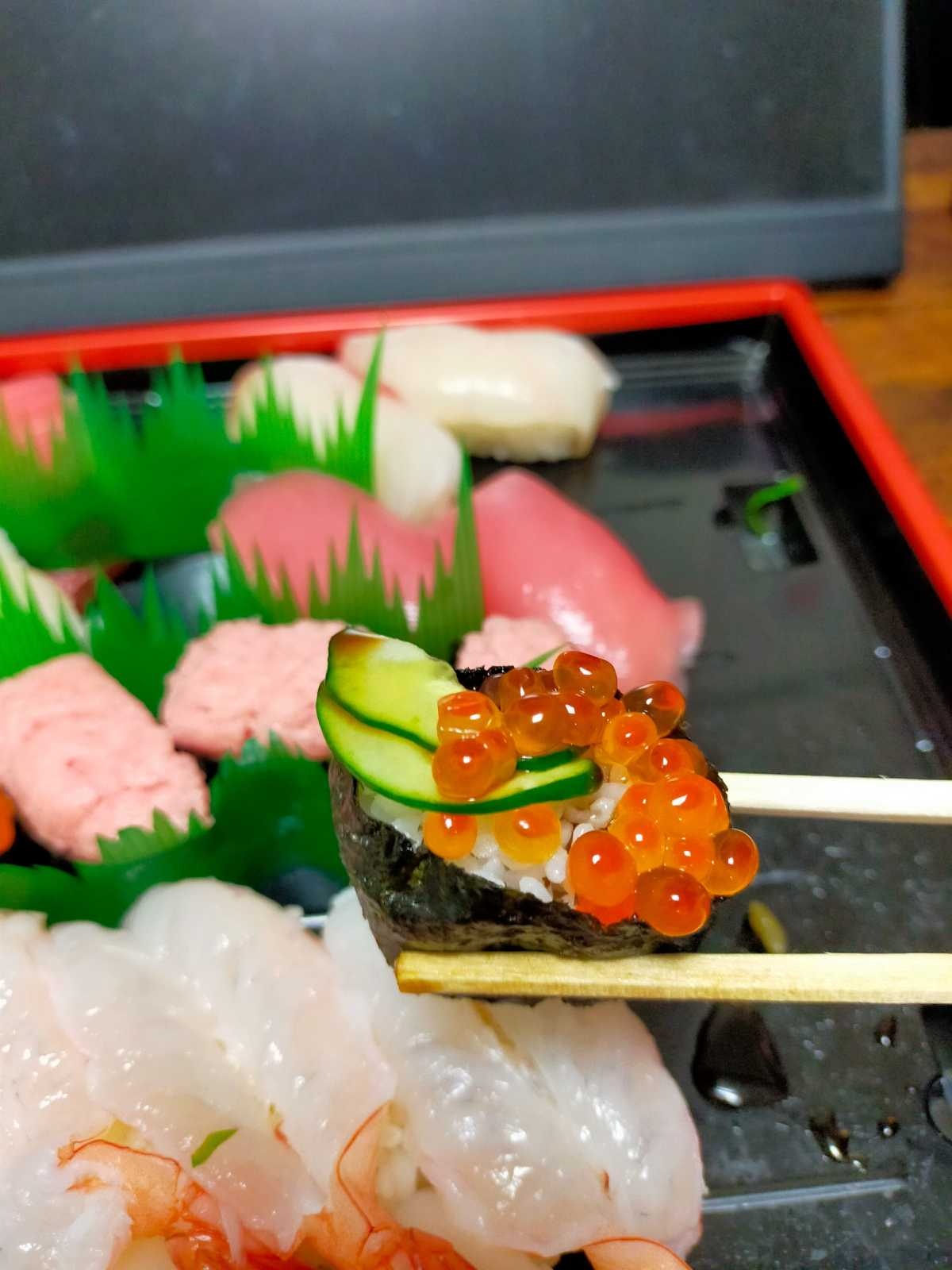 黒黒とした海苔と宝石のようないくらにきゅうりの緑が鮮やかな軍艦