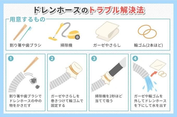 ドレンホースにはカメムシが入りたがる 中で死んで詰まったりする ので そんな時は ドレンホースと掃除機のホースを養生テープで繋いで吸うとよひ