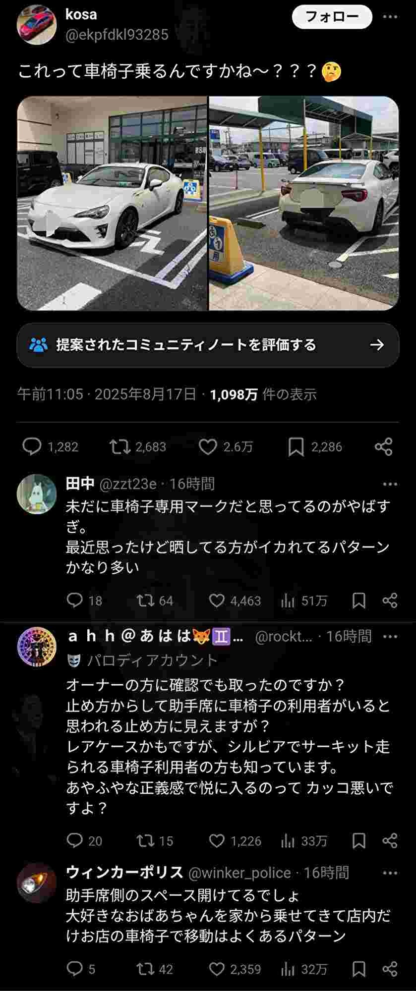 停め方みれば助手席に障がい者乗せてて車椅子に移乗させたんだなってわかりそうなもんなのにSNSに晒す正義マン⋯⋯