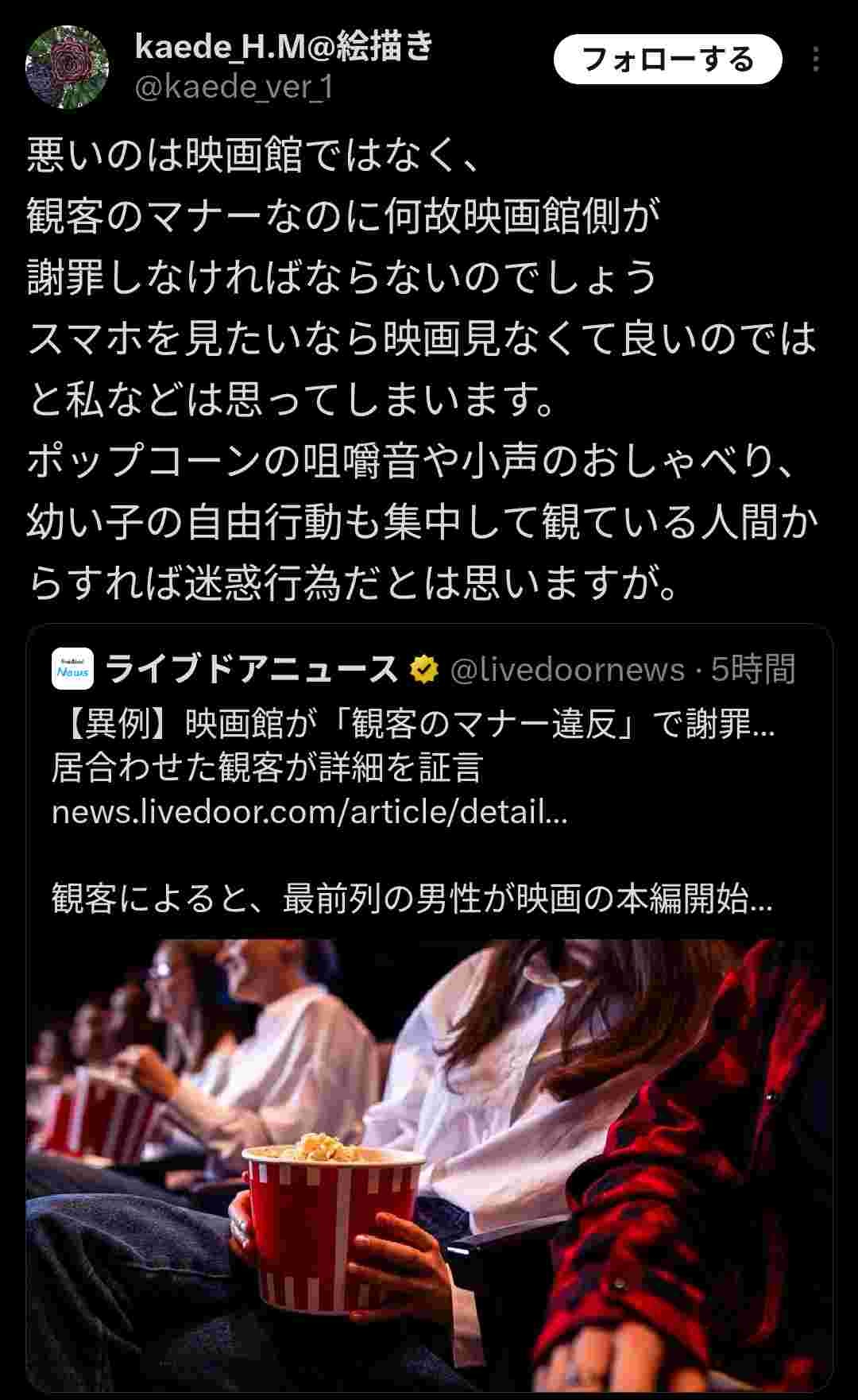 映画館でのポップコーンを食べるのはマナー違反かセーフかで意見が真っ二つに…