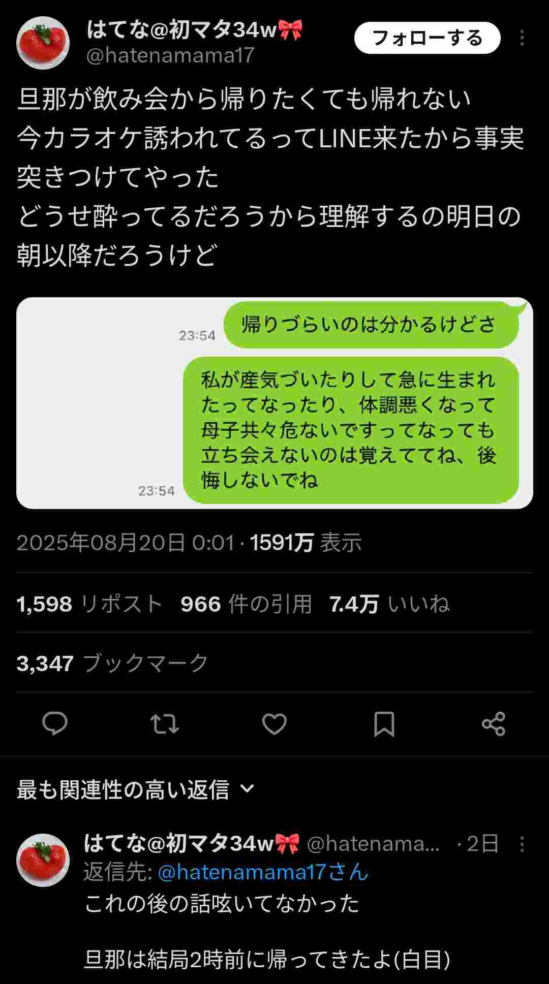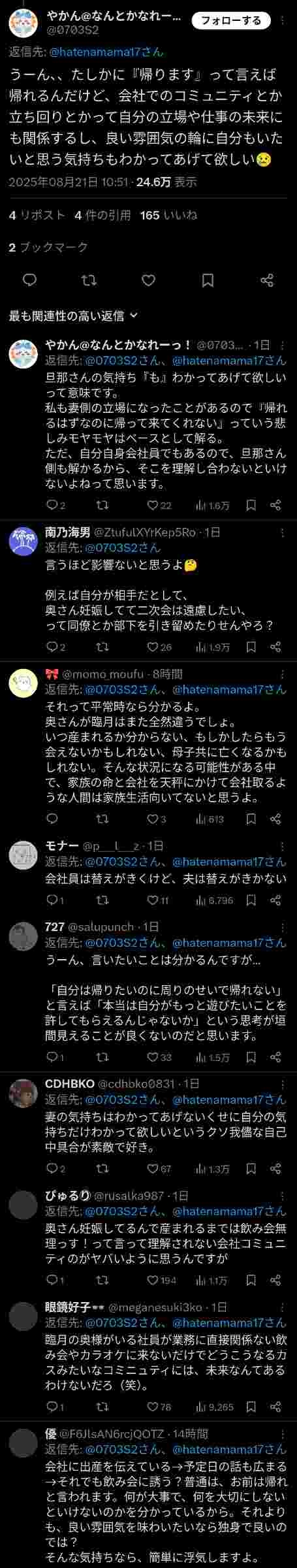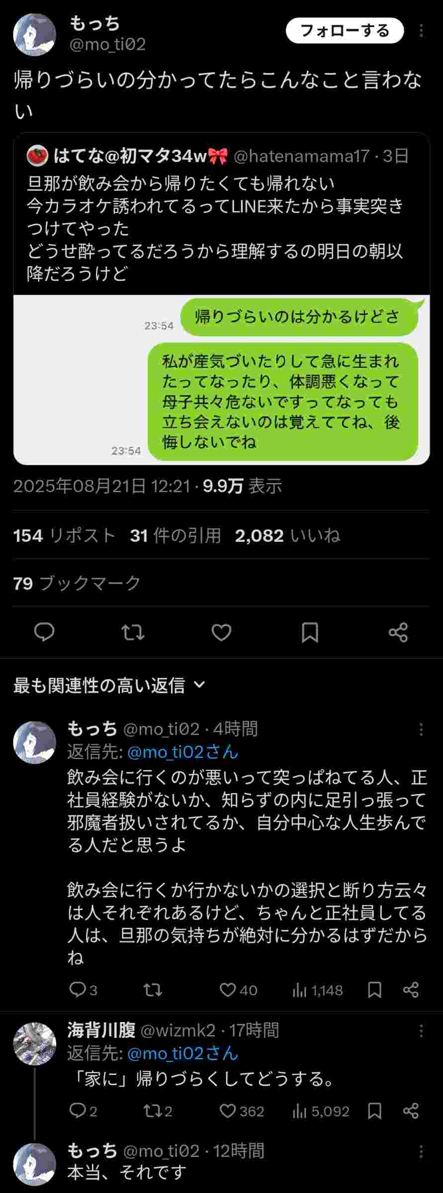 家に出産間近の妻がいるのに会社の飲み会に行き二次会まで付き合うのがアウトかセーフかで意見が真っ二つに…