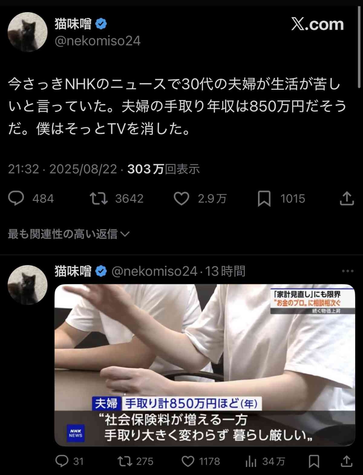 夫婦で税引前の年収1200万くらいか?そら世帯年収3000万のNHK職員からしたら厳しいわな