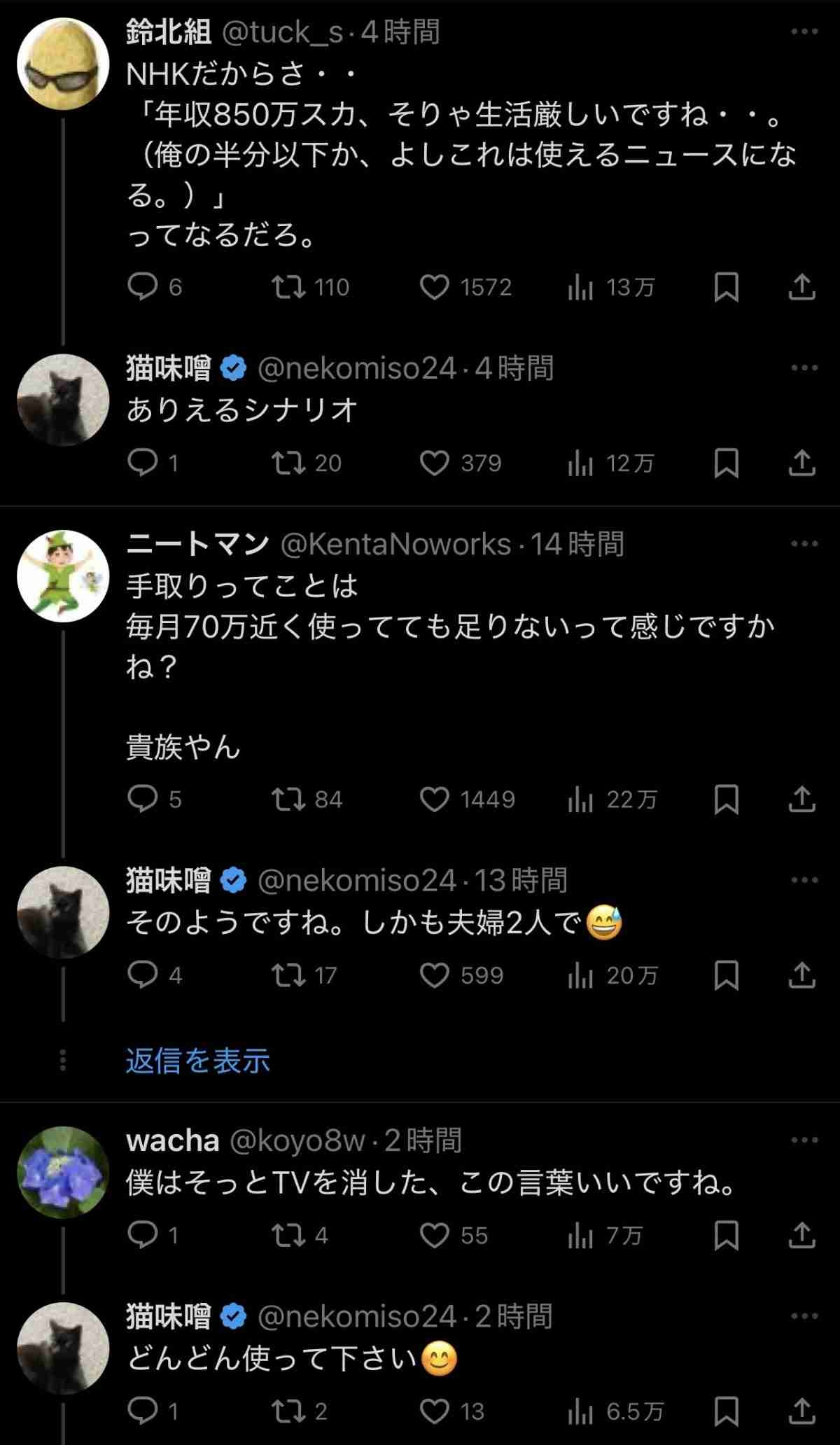 夫婦で税引前の年収1200万くらいか?そら世帯年収3000万のNHK職員からしたら厳しいわな