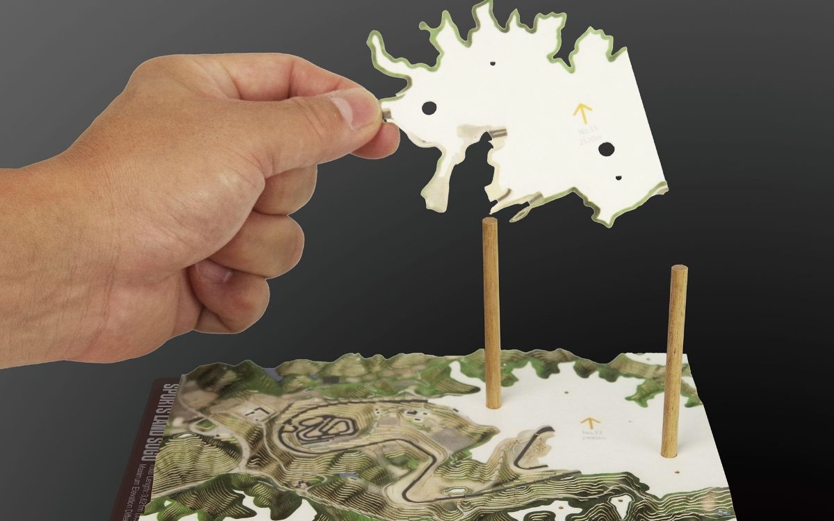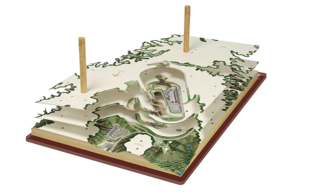 レイヤード ランドスケープキットは、等高線沿いにカットされた粘着シートを積み上げていくことで、リアルな立体地形図作りを楽しむ製品。国内の主要サーキットの多くは、中山間地域に位置し、その地形や傾斜を活かしたコースレイアウトが各サーキットの個性を再現できる。