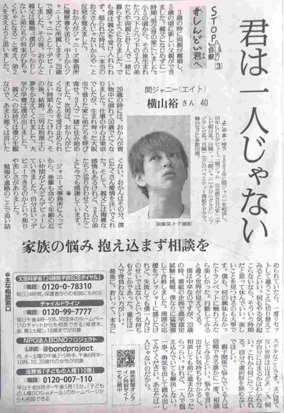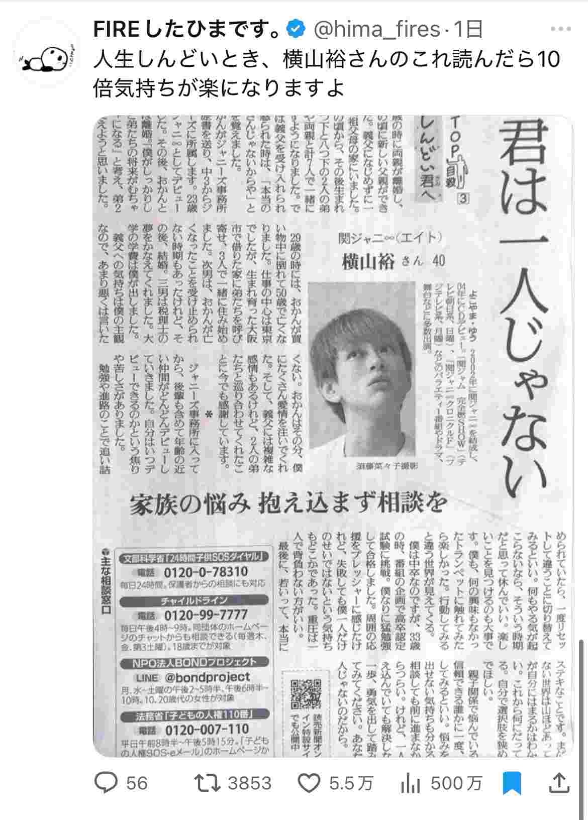 横山裕さんの言葉って、なんか心に響くものがあるよな。しんどい時こそ、そういう存在が大事なのかもな。