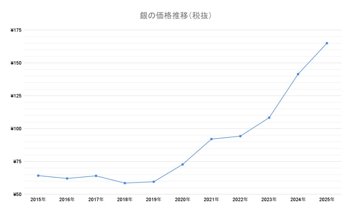 銀の買取価格は、品位(SV1000、SV925など)や、その日の貴金属相場によって変動します。2025年9月2日時点では、田中貴金属の店頭買取価格は1gあたり約210円です