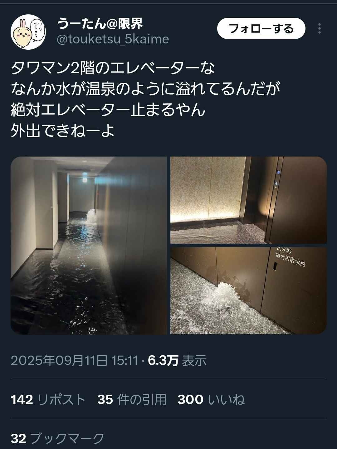 某タワマン、二階なのに雨水が噴出しエレベーター停止、38階まで階段を使う羽目に