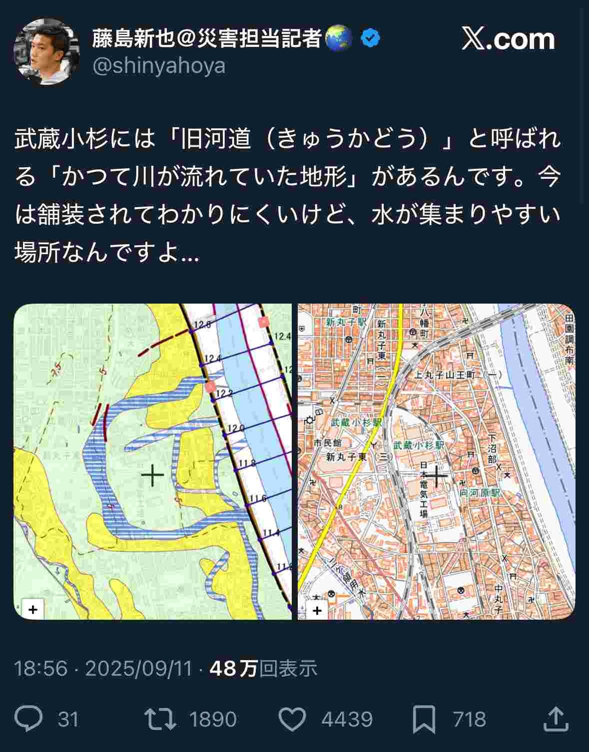 武蔵小杉には「旧河道(きゅうかどう)」と呼ばれる「かつて川が流れていた地形」があるんです。今は舗装されてわかりにくいけど、水が集まりやすい場所なんですよ…旧河道 都市の“見えない川”とは ~浸水に備えるポイント 川崎市と東京・大田区の事例から