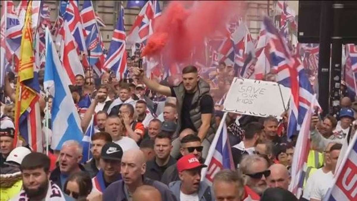 英 反移民デモに10万人以上 一部暴徒化で警察官26人けが