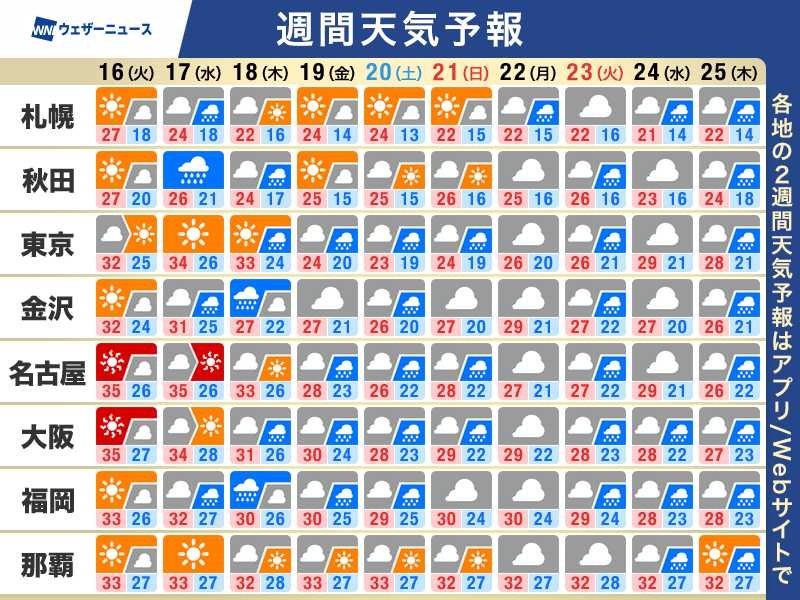 ・週中頃まで厳しい残暑 週末は関東など気温低下週中頃から秋雨前線が南下し、本州南岸付近に停滞する日が続く予想です。