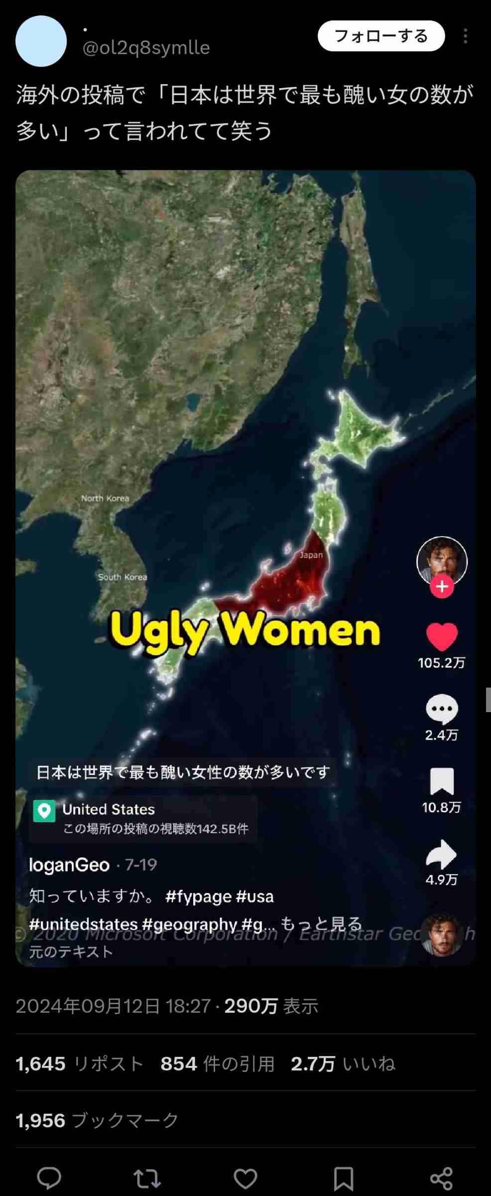 外国人「日本の女は世界で最も醜い。見た目も性格もブサイク」👈105万いいね 日本女性はモテるとの願望が完全に否定される
