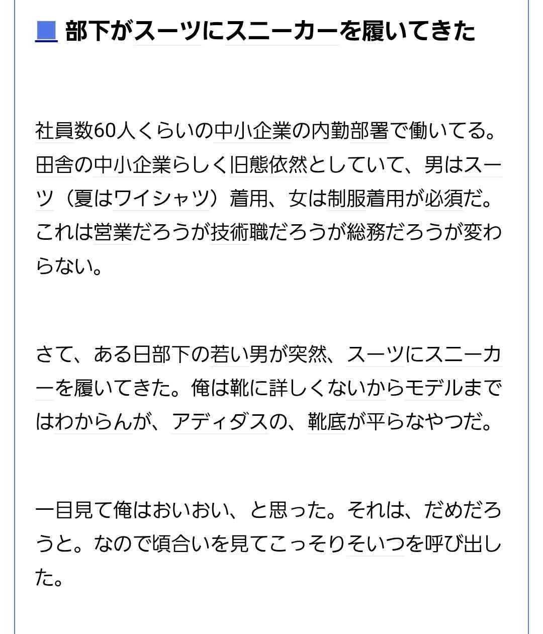 スニーカーの是非はともかくとして部下から舐められ過ぎだろ