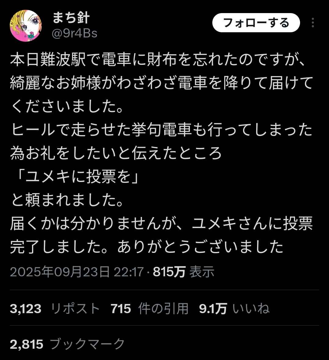 【感動】電車に財布を忘れる→美女が電車を降りて届ける→「何かお礼を」美女「ユメキに投票を」